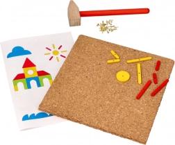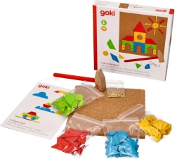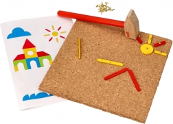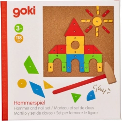 Delight your children with the toy Goki Hammering Game Merry House. This set includes colorful geometric shapes that children can hammer into the cork board using a small wooden mallet. This educational toy supports the development of fine motor skills and creative thinking.