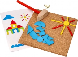 Children improve their fine motor skills and hand-eye coordination while assembling different shapes and pictures on the cork board.