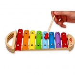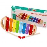Discover fun with this colorful xylophone, offering eight metal keys in rainbow colors. Designed to bring joy and help children develop their musical abilities. Ergonomic shape and comfortable wooden handle make it easy to carry and play.