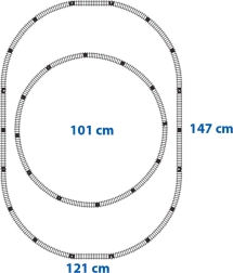 The track system allows for the creation of two circuits, an inner one measuring 101 cm and an outer one 147 cm.