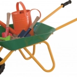 The wheelbarrow includes fun garden tools like a watering can and a trowel, enriching the play experience.