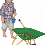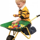 The children's metal wheelbarrow is designed for little explorers and gardeners. It is ideal for transporting toys or materials during outdoor play. The wheelbarrow has a single black plastic wheel, a metal frame, and yellow handles, making handling easy even for the smallest children.