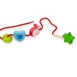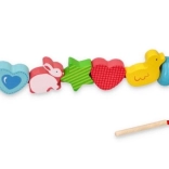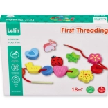 Textile cord with wooden ends for easy threading, helps develop fine motor skills.