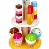 This wooden stand is equipped with many colorful ice creams and popsicles that look like real ones. It is designed to encourage imaginative play in children.