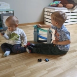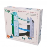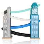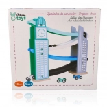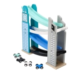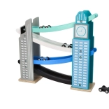 Our wooden raceway is designed to resemble iconic city structures, including a clock tower. It’s made from quality wood and offers several levels with colorful ramps in blue, black, and white. Kids will love releasing the small colorful cars from the top all the way down. The track not only provides fun but also develops fine motor skills and teaches physical principles like gravity and speed.