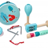 The set includes a tambourine with four jingles and a cute squirrel, a mint recorder, maracas with a floral motif, castanets with a mushroom, handheld bells with a leaf, a metal triangle with a beater, and everything is stored in a practical wooden tray/box for easy storage and carrying. Great for music-making at home, in preschools, and after-school clubs.