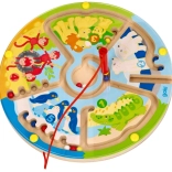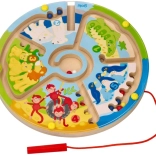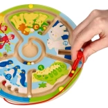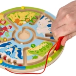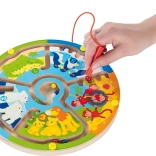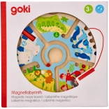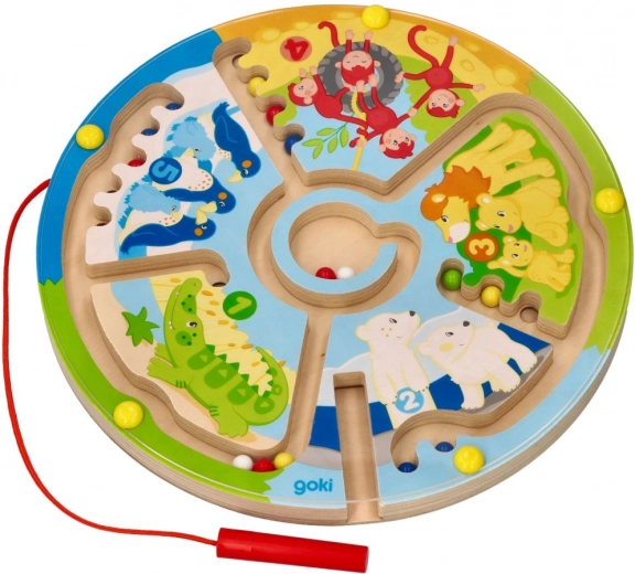 The fun GOKI wooden magnetic maze with a Zoo theme teaches children to guide beads with a magnetic stylus, building fine motor skills, hand–eye coordination, and color and number recognition. Durable plexiglass protects the beads, and the compact 23 cm diameter plus a tethered stylus make it an ideal toy from age 3.
