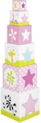 The set includes 6 sturdy cardboard blocks that can be built into a tall tower or nested together. Each block is decorated with friendly illustrations of animals, plants, and numbers, helping children develop basic skills and patience through play.