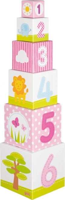 The largest block measures 14.3 × 14.3 × 14.3 cm, and when assembled, the tower reaches up to 57.5 cm in height. Quality workmanship by GOKI ensures safety, non-toxicity, and long-lasting durability—ideal for everyday play.
