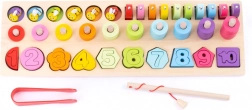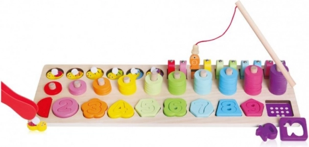 - 4-in-1: counting 1–10, sorting shapes and colors, ring threading, magnetic fishing
