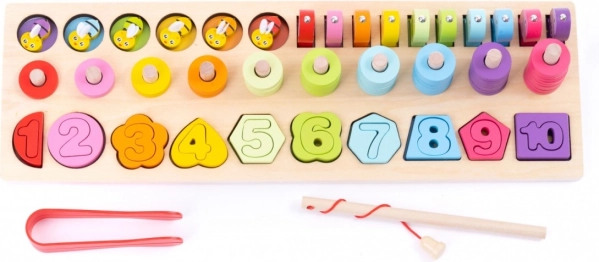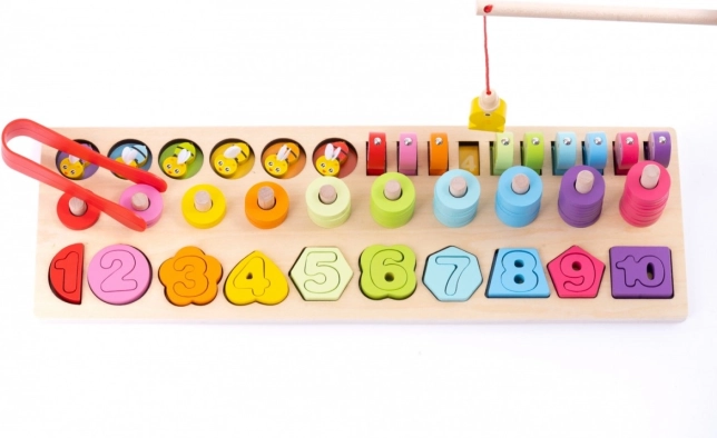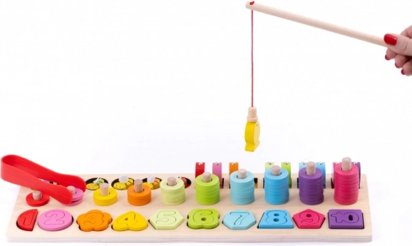 This multifunctional wooden toy is ideal for first steps into the world of counting and shapes. Through play, kids practice color recognition, matching numbers 1–10, threading rings, and catching pieces with a magnetic rod. The set also includes plastic tweezers to increase difficulty and train grip strength.