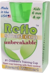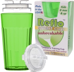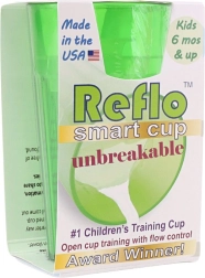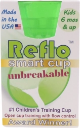 Teach your child to drink from an open cup safely and confidently — the REFLO cup provides flow control for easy training, is unbreakable, suitable from 6 months, has a practical capacity of 170 ml (280 ml total), and is made in the USA.