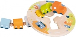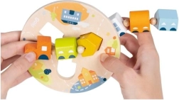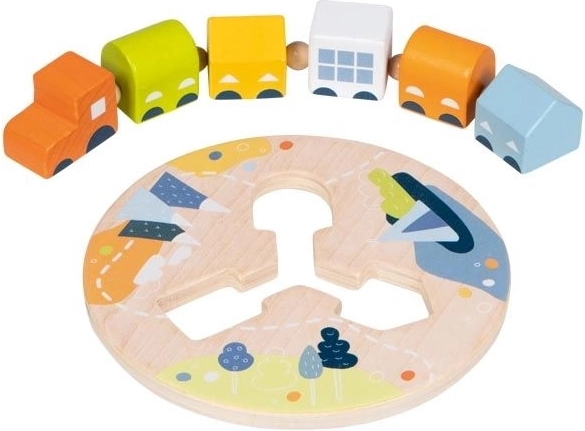 Discover a smart wooden toy that combines fun and learning in one – a threading train with five carriages. Children practice fine motor skills, shape and color recognition, and spatial thinking as they insert the carriages into the correct openings and move the train through the landscape.
