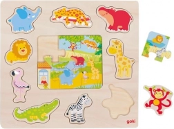 Wooden insertion toy for small children featuring zoo animals offers 9 insertion images and a puzzle with 6 pieces. Ideal for developing children's coordination and thinking.