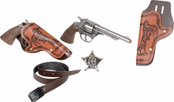 This quality GONHER cowboy set delivers a realistic look and sound action thanks to the mechanism for 8-shot cap belts (drum type). The metal construction ensures higher durability and long life, while the included holster and badge complete the authentic look of a little sheriff.