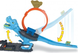 - Track with loop, T‑Rex figure, launcher, 1 Hot Wheels 1:64 car