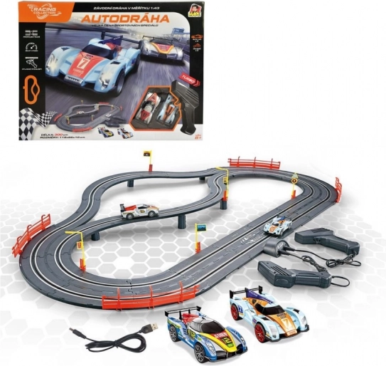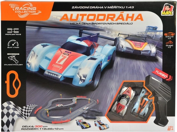 The package includes two race cars and two hand controllers for instant starts and precise speed control. The track is packed in a Czech box and makes an ideal gift for racing enthusiasts young and old.