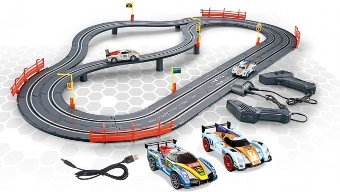 This quality slot car track brings fun for the whole family. Thanks to the 300 cm track length and dynamic layout with a bridge, you’ll enjoy exciting head-to-head duels. Easy USB power lets you connect the track to a standard USB adapter, power bank, or computer (power source not included).
