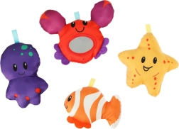- Toys in the shape of a fish, octopus, star, and a box with a mirror