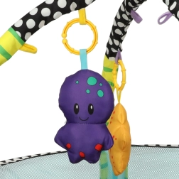 - Toys and balls: The mat includes colorful, soft toys such as a fish, octopus, star, and a box with a mirror. Additionally, 30 plastic balls in vibrant colors stimulate the child’s senses.