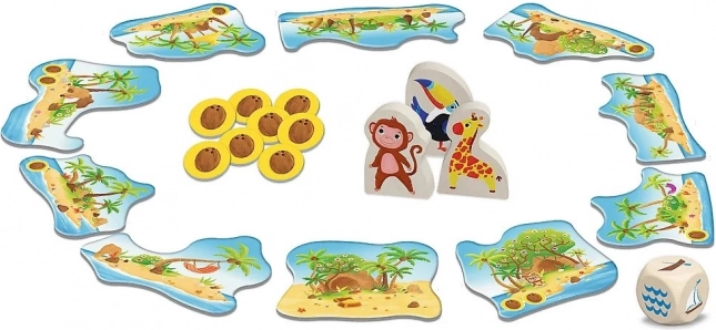 - 9 islands, 1 mainland, 8 coconuts, 3 wooden figures, 1 large wooden die, Parent's guide