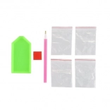 The set contains all the supplies for diamond painting: canvas, application pen, tray, wax, and colored stones.