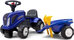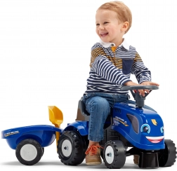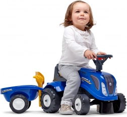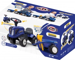 The blue NEW HOLLAND ride-on tractor by Falk is a great choice for little farmers’ first rides. It features a detachable trailer, a steering wheel with horn, a stable frame, and wheels made of high-quality plastic. It comes with sand toys – a shovel and a rake and even two sets of stickers, including a cheerful “smiling” version for personalization.