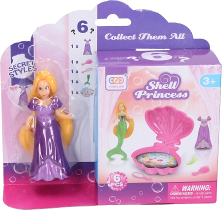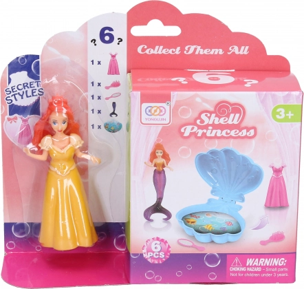 Discover a magical underwater world with the adorable mermaid with shell toy measuring 9.5 cm. The set includes a mermaid, an opening shell, tiny dress, a mirror, and a comb. Available in 3 shell colors – yellow, blue, and purple.