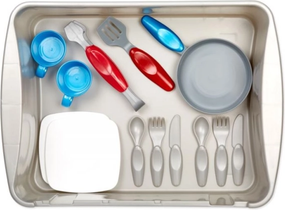 The set includes 13 accessories (plates, cups, cutlery, pot, pan, etc.) that promote independence, hand–eye coordination, and social skills when playing with friends.