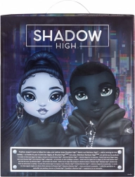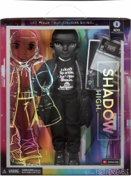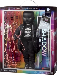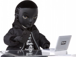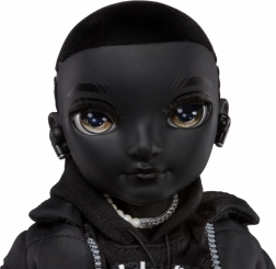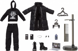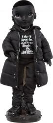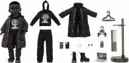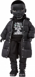 The doll is dressed in a stylish black outfit with a modern and urban look, including a long black coat and accessories.