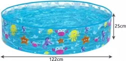 The pool specifications include a capacity of 277 liters and dimensions of 122 cm x 25 cm, making it ideal for small children. Weighing only 950 g, it is easy to handle and portable. The package includes a waterproof repair patch, allowing quick fixes even when the pool is filled with water.