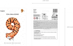 Liven up a birthday party with a stylish foil balloon in the shape of the number 9 with a tiger motif. The balloon is suitable for filling with helium or air, inflates to approximately 49 × 76 cm, and the package includes a straw for easy inflation.
