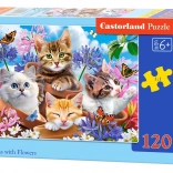 Colorful children’s puzzle featuring adorable kittens and flowers will delight young puzzle lovers. It includes 120 pieces and assembles into a 32 × 23 cm image. The pieces have pleasant, aesthetic colors and quality craftsmanship that supports concentration, imagination development, and patience.