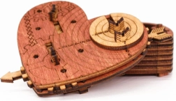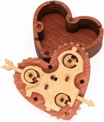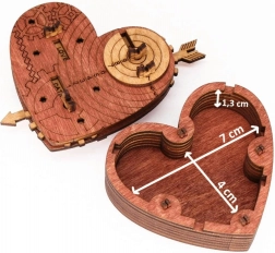 This stylish heart with gears and engraving hides a clever code mechanism. After setting the correct three words, simply pull the arrow and the lid opens. Use the heart as a secure case for a small item, a personal note, or as a designer puzzle on display.