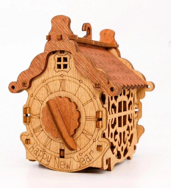 This decorative wooden house-shaped box with a clock face and “Happy New Year” inscription combines a clever puzzle mechanism with stylish design. Inside is space for a small item that the recipient can access only after solving the secret lock. With the hanging loop, you can easily place it on a Christmas tree or branch.