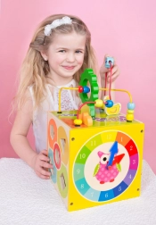 The multifunctional motor skills cube from Bino is a high-quality wooden toy for the little ones that develops fine motor skills, logical thinking, and concentration. It offers different activities on each side, including shape sorting and inserting. Made from quality wood and finished with non-toxic paints that meet EU standards.