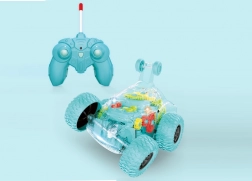 Fun RC car with a transparent green chassis that reveals the moving gears and offers 360° standing spins, stunt tricks, light and sound effects, and easy control forward/backward and left/right. Controller range up to 10 m, top speed 5 km/h.