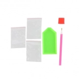 - Canvas with pre-printed motif and adhesive layer, applicator pen, tray, wax, set of colored drills, symbol legend