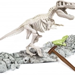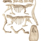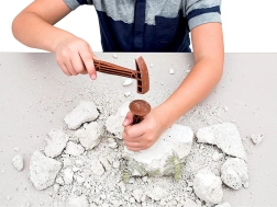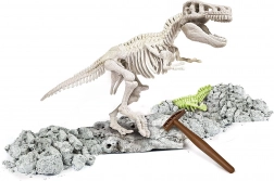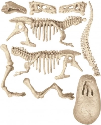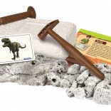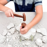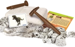 Le kit comprend un bloc de « terre », un petit marteau et un burin. Les enfants s’essaient à de véritables fouilles puis assemblent, à partir des pièces mises au jour, un squelette détaillé de T‑Rex.