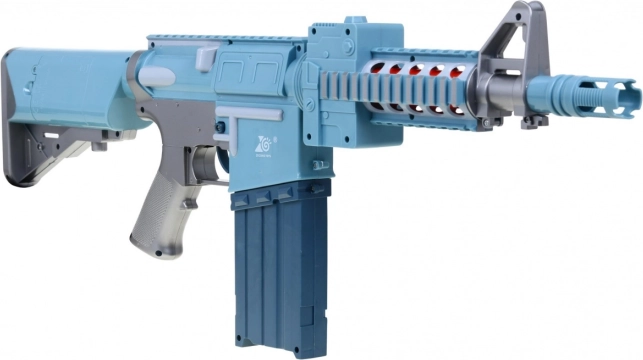 Le compresseur électrique alimenté par 5× piles AA (non incluses) assure un tir fluide et entièrement automatique – il suffit d’appuyer sur la gâchette, chaque pression déclenche un tir. Pour la sécurité des enfants, la gâchette peut être bloquée via l’interrupteur ON/OFF. Le long canon avec rouleaux de guidage stabilise le tir pour une meilleure précision.