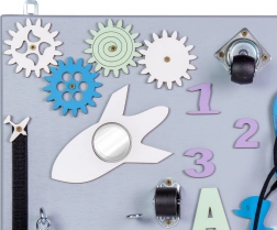 - Équipement riche : engrenages colorés, fermeture éclair, sonnette, deux types de verrous/verrouillages coulissants, chaussure avec lacet pour s’entraîner à nouer, chiffres et lettres en bois, roues rotatives, velcro, parcours avec petite voiture coulissante, ardoise en forme de bus pour écrire à la craie, crochet, miroir incassable en forme de fusée, horloge avec aiguilles mobiles, trieur de formes à trois éléments, règle et interrupteur.