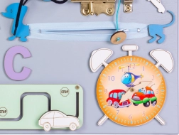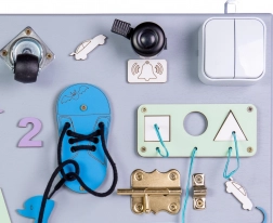 Découvrez un jouet ludique et éducatif pour les tout-petits – une table de manipulation en bois qui développe la motricité fine et la pensée logique. Grâce à de nombreux éléments du quotidien, les enfants peuvent essayer en toute sécurité d’allumer, tourner, faire coulisser ou lacer, exercer la coordination œil-main et la concentration. La planche peut être posée debout, à plat ou suspendue au mur.