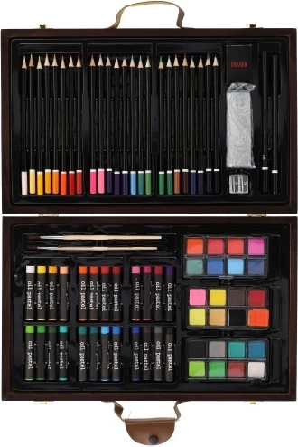 Contient des crayons de couleur, des crayons de cire, des crayons à papier, des peintures à l'eau, des pinceaux, un taille-crayon et une gomme - au total 79 pièces de fournitures artistiques de base.