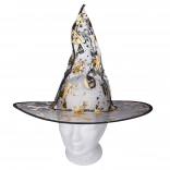Élégant déguisement de sorcière de couleur dorée comprenant une robe et un chapeau, idéal pour le carnaval, les bals masqués et Halloween. Disponible en tailles S, M, L.