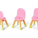 Les petites chaises ont des sièges roses et des pieds en bois légers avec des extrémités néon jaunes, parfaites pour les enfants.