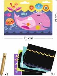 Coffret créatif pour petits explorateurs comprenant 5 grandes cartes à gratter avec des animaux et un stylet en bois double face pour gratter facilement les surfaces et les détails. Idéal dès 18 mois, développe la motricité fine, la patience et la joie de créer.