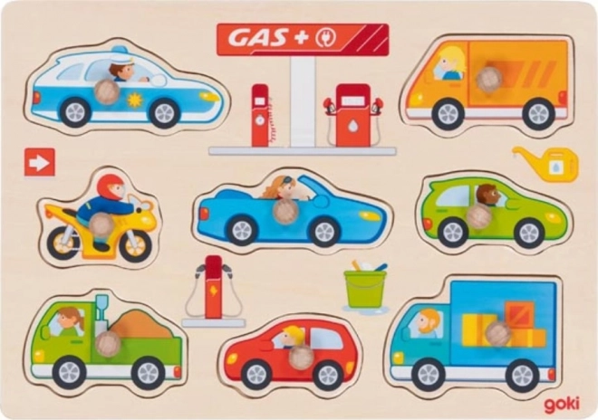 Ce puzzle à encastrer en bois Goki sur le thème de la station-service est un excellent choix pour un premier puzzle. Les pièces munies de poignées sont faciles à saisir pour les enfants et, grâce aux cadres sur la base solide, restent bien en place. Le jeu développe en toute sécurité la motricité fine, la patience ainsi que la reconnaissance des formes et des images.