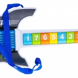 | Fonctions | - bouton marche/arrêt, - le bouton stop arrête la musique, - le bouton « sample » joue 8 morceaux de démonstration, - le bouton « rhythm » joue 8 rythmes de guitare, - le bouton « tone » propose 3 sons de guitare différents, - les boutons 1,7,6,5,4,3,2,1 servent à jouer, - des lumières colorées sur la guitare clignotent pendant le jeu, - la sangle peut être passée sur l’épaule. |