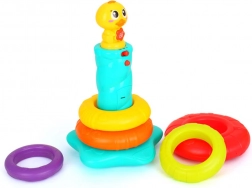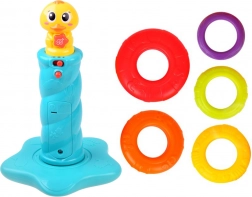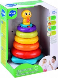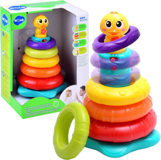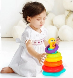 La tour empilable interactive avec petit canard apporte aux enfants la joie de la découverte. Cinq anneaux colorés s’enfilent sur une tige stable surmontée d’une tête de canard, qui émet des sons ludiques et des coassements et allume un voyant clignotant pendant le jeu. Lorsque l’enfant ne joue pas pendant un moment, le canard se rappelle par des sons gais et invite à explorer.