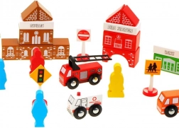 Les blocs ont une texture agréable et sont de taille appropriée pour les petites mains d'enfants. Exemples de dimensions : bâtiments (env. 3cm x 6cm x 3cm), ambulance (3,5cm x 5cm x 3cm), camion de pompiers (5,5cm x 8,5cm x 3cm), police (4cm x 6cm x 3cm), figures (5cm x 2,5cm x 1cm), panneaux de signalisation (hauteur 7cm) fabriqués en plastique.